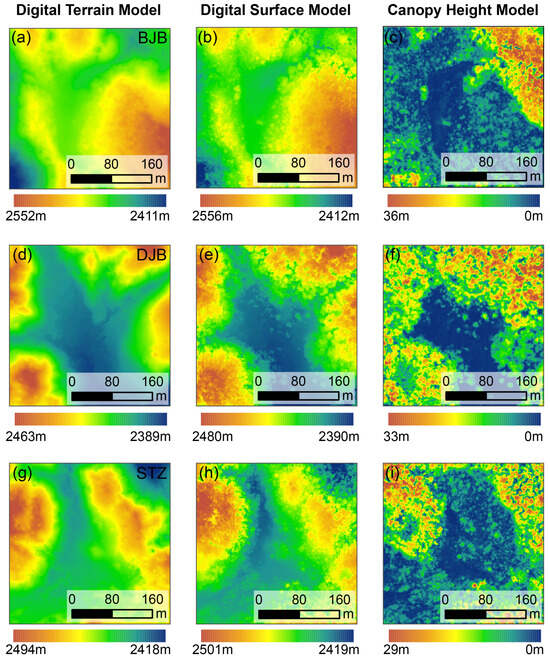 The digital terrain model (DTM), digital surface model (DSM), and canopy height model (CHM) of the three sample sites used in our study (for details, see Figure 2). (a–c) show the BJB site, (d–f) show the DJB site, and (g–i) show the STZ site.