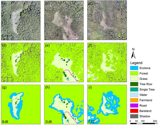 The orthoimage of three sample plots (a–c), fine-scale landscape pattern map derived from UAV-data (d–f), and landscape pattern maps including the delineated ecotones (shadows removed) (g–i).