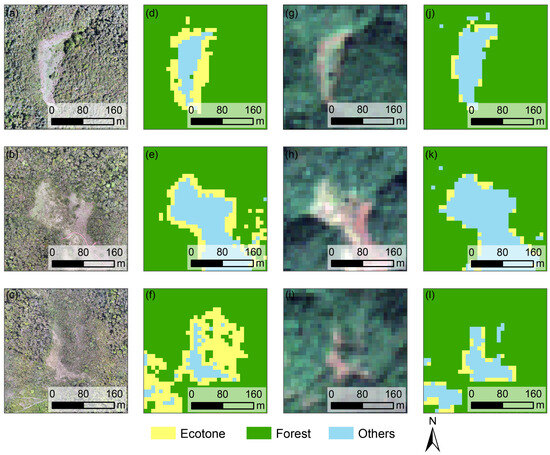 Comparison of the classification using only satellite data and the upscaling model. The orthoimage of three sample plots (a–c), landscape pattern map derived from the upscaling model (d–f), Sentinel-2 imagery of three sample plots (g–i), and landscape pattern map derived from only satellite data (j–l).