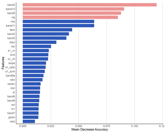 Subsequently, the importance of input variables for RF was calculated (Figure 7). As indicated by the variable importance for detecting ecotones, multispectral data from Sentinel-2 were far more suitable than the SAR data from Sentinel-1. In these bands, the red band (band 4), shortwave infrared band (band 12), and vegetation red edge band (band 5) were identified as the three most important variables. VIg was the most important vegetation index for the ecotone upscaling model.