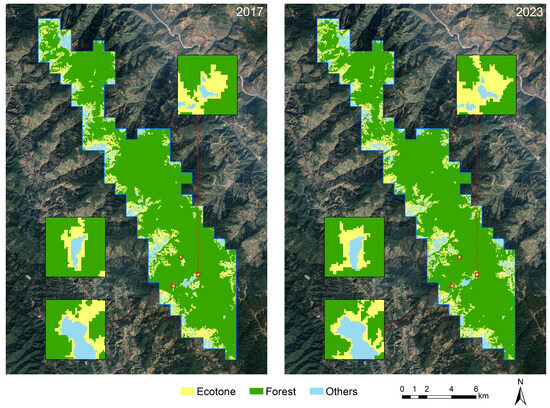 By applying the upscaling model to the satellite images of 2017 and 2023, the landscape pattern maps of ecotones in these two years were obtained (Figure 8) and the area of different land use types was calculated, with the “Others” category including grassland, water, road and other classes except forest and ecotone. Overall, the area of the ecotones increased by 0.287 km2 in these six years (Table 7).