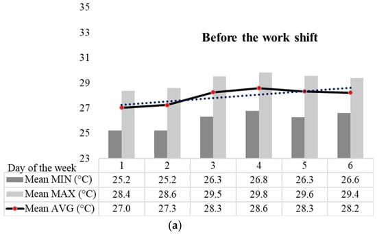 It is important to note that the average minimum temperature varied the most during the six days of the work shift (4.3 °C), peaking after the shift on the second day (31.0 °C) and causing the greatest variation on that day (5 °C). On the fifth day there was another peak in the average minimum temperature (31.2 °C), but with less variation (4.9 °C) after the working day. It was also observed that the minimum temperature in the period before the working shift increased until the fourth day, with a similar behavior to the maximum temperature.
