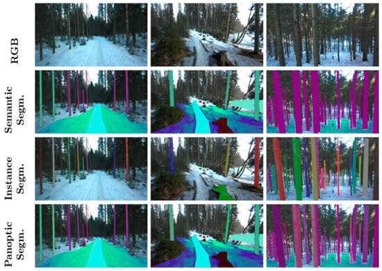 Example of RGB images and corresponding semantic, instance, and panoptic segmentation from the FinnForest dataset.