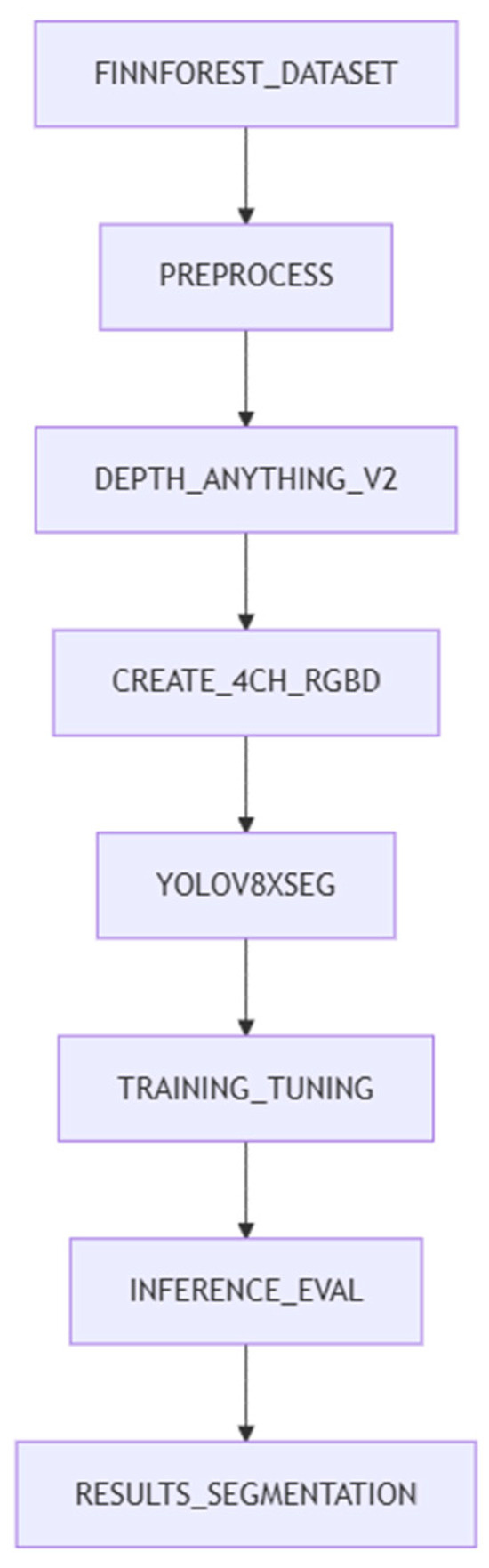 The largest YOLOv8x-seg model variant was employed for this study. YOLOv8 utilizes a CSP-DarkNet53 architecture for feature extraction, enhanced by CSP (Cross-Stage Partial Networks), which improves gradient flow and reduces computation. It incorporates PANet (Path Aggregation Network) to refine feature maps from different layers, improving object localization. It uses anchor-free detection, simplifying the object detection pipeline and enhancing performance on complex backgrounds like forests. YOLOv8x-seg adds a mask prediction branch, which applies convolutional layers to generate segmentation masks for detected objects. The modified model uses 4-channel RGB-D data, where the additional depth channel provides spatial information to improve tree segmentation by using the Ultralytics4Channel repository [11]. The Depth Anything V2 model was employed to generate depth maps, transforming standard RGB images into RGB-D format. The model uses a specialized loss function to optimize segmentation accuracy, incorporating weighted depth-based loss to emphasize depth-aware object boundaries [29]. This enhances the ability of the model to detect and categorize objects in three-dimensional space [30]. The simplified solution architecture is given in Figure 2.