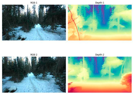 In this research, the incorporation of depth information relied on the Depth Anything V2 model and the Ultralytics4Channel (https://github.com/g-h-anna/ultralytics4channel (accessed 25 February 2025)) [15] repository, a specialized adaptation of YOLOv8 architecture designed for RGB-D data [16]. Depth Anything V2 was employed to extract the relative depth information from RGB images, providing additional spatial context, such as tree sizes and distances, which enhanced segmentation accuracy significantly. By combining the extracted depth data with RGB imagery to form 4-channel (RGB-D) inputs, the Ultralytics4Channel library facilitated seamless processing and training for depth-enhanced segmentation tasks. A sample is presented in Figure 3.