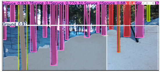 A performance comparison between the baseline YOLOv8 model and the depth-enhanced YOLOv8 model depicted a major difference between the sample without depth information and the one with depth information. For spruce segmentation, the baseline YOLOv8x-seg model achieved a mAP50 of 0.778 and a mAP50-95 of 0.472 for masks. After incorporating depth information, the mAP50 improved to 0.848 (+0.070) while the mAP50-95 improved to 0.523 (+0.051) for mAP50-95, which indicated a significant enhancement in segmentation accuracy. In the case of ground segmentation, the baseline model had a mAP50 of 0.750 and a mAP50-95 of 0.460. After incorporating depth information, the performance increased slightly to 0.770 (+0.020) for mAP50 and to 0.485 (+0.025) for mAP50-95. This depicted a more modest improvement compared to the Spruce segmentation. The samples are shown in Figure 3 and Figure 4. Please note that the annotations in the FinnForest dataset are not very accurate. For this reason, the score for ground segmentation in Figure 3 is higher than in Figure 4, even though ground segmentation looks more accurate in Figure 4.