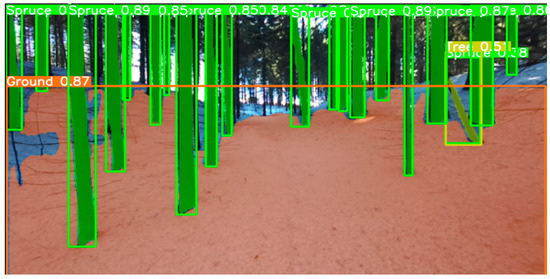 Notable performance gains were observed in specific classes, such as “Spruce”, where the mAP50 increased from 0.778 to 0.848 and the mAP50-95 improved from 0.472 to 0.523. These results emphasize the importance of depth information in recognizing objects with diverse three-dimensional structures. Although improvements in ground detection were also observed, with mAP50 rising from 0.750 to 0.770 and mAP50-95 increasing from 0.460 to 0.485, these gains were more modest, indicating that depth data have a greater impact on vertical structures than on flat surfaces. This enhanced performance is attributed to the model’s ability to detect even subtle variations in object depth, reinforcing the value of depth information in forestry applications.