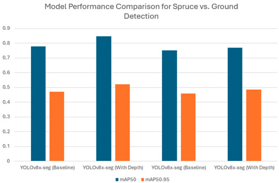 Generally, the integration of depth information using Depth Anything v2 improved the tree recognition capabilities of the YOLOv8x-seg model on the FinnForest dataset. The improvement in Spruce segmentation, with mAP50 increasing from 0.778 to 0.848 and mAP50-95 increasing from 0.472 to 0.523, depicts the importance of depth information in refining the accuracy of object segmentation. Although Ground segmentation also benefited from improved performance following the incorporation of depth information, such improvements were less pronounced compared to Spruce segmentation. This comparison is presented graphically, as shown below in Figure 5.
