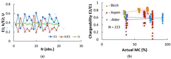 - For three hardwood species—birch (Betula spp.), aspen (Populus spp.), and black alder (Alnus glutinosa (L.) Gaertn)—rather surprisingly, it was found that the average electrical chargeability, Cha(E), in the wood was practically independent of the wood’s average MC in the region above the FSP (see Table 1 and Figure 6b). The actual density of the birch wood sample was 0.66 g/cm3. The actual density of the aspen wood was 0.53 g/cm3. The actual density of the alder wood sample was 0.46 g/cm3. On the other hand, the average electrical chargeability was found to be of the same order of magnitude as the basic density (i.e., the dry weight divided by the wet volume (above the FSP)) for the same wood species. If the hypothesis of an approximate numerical equivalence between the wood’s basic density and its average electrical chargeability is confirmed by further studies, then the possibility opens up that the wood’s chargeability can be used to predict the wood’s basic density in a non-destructive way, something that is similar to that of the use of a resistograph [26].