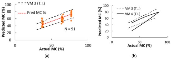 - Comparing the tolerance intervals (T.I.s) of the R-model (VM 1, VM 3, VM 5) and U-model (VM 2, VM4, VM6) single measurements shown in Figure 7b, Figure 8b and Figure 9b, similar trends as in the paper by Tamme (2021) [8] were observed. Namely, the T.I. of the R-model expanded with increasing wood MC, while the T.I. of the U-model concentrated at a single point with increasing wood MC.