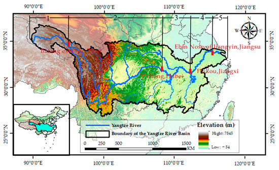 Geographical location map of Yangtze River Basin, China (1: Source; 2: Upper reaches; 3: Middle reaches; 4: Lower reaches; 5: Estuary).