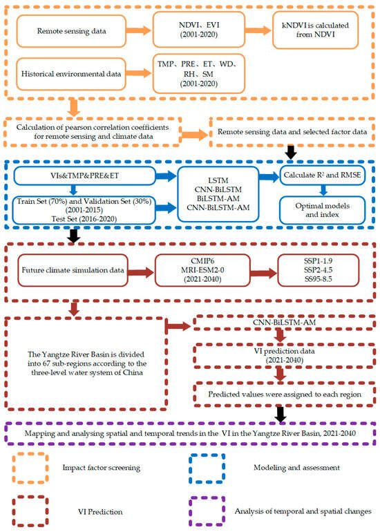 In this study, by determining the Pearson correlation coefficient, we first eliminated the meteorological variables that were not strongly connected with the VI. Subsequently, the deep learning model of the VI time series prediction model combining multi-dimensional inputs was constructed by using historical VI and climate data (2001–2015). Next, the model was tested using the data from 2016 to 2020. Thirdly, the above model and the climate simulation data under three different scenarios were used to predict the VI of the Yangtze River Basin in the next 20 years (2021–2040). Finally, the future vegetation change trend in the Yangtze River Basin was analyzed. The workflow is shown in Figure 2.