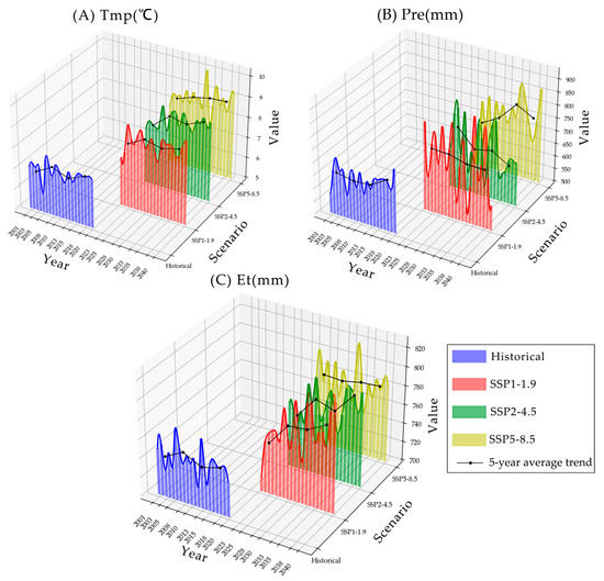 Trends in three climatic factors from 2021 to 2040 ((A): Temperature; (B): Precipitation; (C): Evapotranspiration).