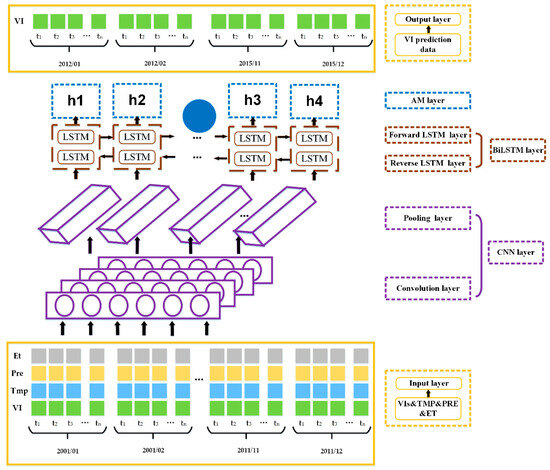 At the same time, many studies have made significant progress in VI time series prediction, which has attracted the interest of various disciplines [8]. From traditional statistical methods, such as Least Absolute Shrinkage and Selection Operator (LASSO) and Autoregressive Moving Average (ARMA), to machine learning techniques like Support Vector Machine Regression (SVR), Extreme Learning Machine (ELM), and Artificial Neural Networks (ANN), significant progress has been made in VI time series prediction [9,10,11,12,13]. For example, Huang et al. [14] combined ANNs and SVR to improve the prediction accuracy of the NDVI in the Yellow River Basin, while Wu et al. [15] applied time-delayed neural networks for NDVI prediction in arid regions. These models address the complex nonlinear relationships in data that traditional methods struggle with and have been recognized as more robust alternatives. Nevertheless, machine learning methods often fail to fully capture the intrinsic features of time series data [16]. In contrast, deep learning methods, particularly Long Short-Term Memory (LSTM) networks, offer significant improvements by capturing complex temporal dependencies in data [17,18,19]. For example, Cao et al. [20] demonstrated that LSTM outperforms LASSO and Random Forest (RF) in predicting rice yield in China. However, due to structural limitations, most LSTM-based models encounter challenges when processing multi-dimensional, grid-based data. The CNN-LSTM hybrid model, which combines Convolutional Neural Networks (CNN) for spatial feature extraction with LSTM for temporal learning, effectively addresses these limitations [21,22]. Bounoua et al. [23] found that this model captures both spatial and temporal dependencies more effectively, highlighting its advantages in crop water stress prediction. Additionally, incorporating the AM enhances the model’s performance by focusing on the most critical features, thereby reducing the computational load associated with multi-dimensional inputs.