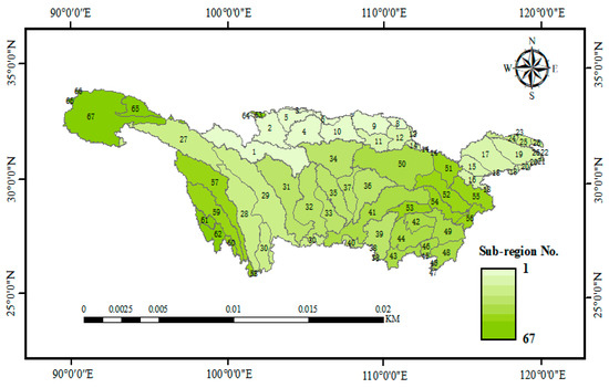 Based on a pre-trained VI time series prediction model, climate simulation data from 2021 to 2040 were used as inputs to forecast VI changes under three scenarios for the next 20 years. Considering the significant geographical span of the Yangtze River Basin and its pronounced variations in climate, environment, and human activities, treating the entire basin as a single prediction unit lacks regional representativeness and fails to provide effective guidance for ecological and environmental policymaking. To address this issue, the basin was divided into 67 sub-regions based on China’s Level-3 river classification system (Figure 5), and predictions were conducted for each region individually. The predicted VI values from 2021 to 2040 under three scenarios were averaged every five years and visualized in vector maps. Moreover, the spatial changes in the VI in the Yangtze River Basin were exhibited based on the rate of VI change. The calculation method is shown in Formula (3).