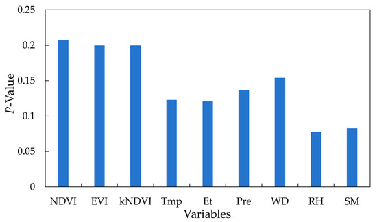 The Kolmogorov–Smirnov normality test showed that the p-values for the significance tests of VIs and environmental factors were both greater than 0.05, indicating that the data follow a normal distribution (Figure 6). According to Table 3, temperature, precipitation, and evapotranspiration showed strong correlations with VIs, with a mean correlation coefficient of 0.662. On the contrary, the remaining three factors had low correlations with VIs from −0.444 to 0.497. And the Variance Inflation Factor (VIF) values between temperature and precipitation, temperature and evapotranspiration, and precipitation and evapotranspiration were 1.843, 1.843, and 1.863, respectively, all below 10, indicating no multicollinearity. Therefore, these three factors were selected for model construction. This reduces the error brought on by erroneous or duplicate input data, which enhances the model’s processing effectiveness and forecast accuracy.