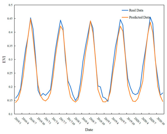 After several parameter adjustments, we arrived at an optimal model configuration that achieved good training efficiency and accuracy. The Mae loss function and Adam optimization algorithm were selected for their excellent performance in various training scenarios. The model was initialized with a learning rate of 0.01 and a timestep of 5 and was trained for 200 epochs. To fine-tune the weights in the later stages of training to avoid overfitting, we set the learning rate tuning strategy to a decay factor of 0.1, which, in this study, meant that the learning rate would decrease by 90% after 180 epochs. The experimental results indicate that all four models exhibit strong predictive performance. As shown in Table 4, the CNN-BiLSTM-AM model demonstrates extremely high accuracy in predicting the EVI, with the lowest RMSE (0.023), the lowest MAE (0.015), and the highest R2 (0.951). Additionally, the CNN-BiLSTM-AM model achieves outstanding performance in testing data from 2016 to 2020, particularly for EVI predictions, with accuracy metrics of R2 = 0.981, RMSE = 0.022, and MAE = 0.019. Moreover, the EVI prediction curve based on the CNN-BiLSTM-AM model closely aligns with the trends in the actual curve, effectively capturing abrupt changes at peaks and turning points (Figure 7). These data show that the model combining a CNN and BiLSTM with the AM can more effectively capture and analyze the spatiotemporal characteristics of the data when dealing with VI prediction containing complex temporal dependencies, thus providing more accurate prediction results. Therefore, we finally selected the CNN-BiLSTM-AM model and the EVI to predict the VI in the Yangtze River Basin from 2021 to 2040.