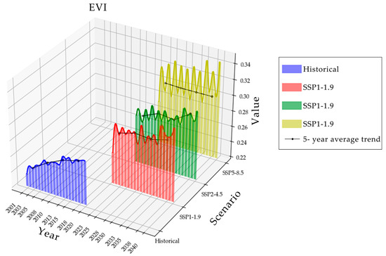 Temporal variation in EVI in Yangtze River Basin from 2001 to 2040.