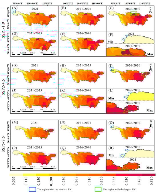Spatial trends in the EVI from 2021 to 2040 under three SSP scenarios in the Yangtze River Basin. (A–E) represent EVI distribution in the years of 2021, 2021–2025, 2026–2030, and 2036–2040, respectively, under the SSPl-1.9 scenario; (F) represents the locations and periods with the maximum and minimum EVIs under the SSPl-1.9 scenario; (G–K) represent EVI distribution in the years of 2021, 2021–2025, 2026–2030, 2031–2035 and 2036–2040, respectively, under the SSP2-4.5 scenario; (L) represents the locations and periods with the maximum and minimum EVIs under the SSP2-4.5 scenario; (M–Q) represent EVI distribution in the years of 2021, 2021–2025, 2026–2030, and 2036–2040, respectively, under the SSP5-8.5 scenario; (R) represents the locations and periods with the maximum and minimum EVIs under the SSP5-8.5 scenario.