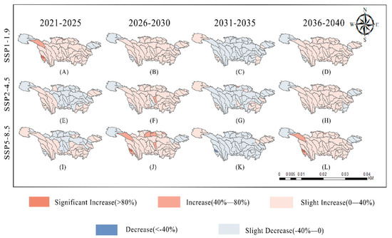 Change rates in 67 sub-regions at five-year intervals relative to the previous five-year period ((A–D) represent the trends in the EVI for the periods of 2021–2025, 2026–2030, 2031–2035, and 2036–2040, respectively, under the SSP1-1.9 scenario; (E–H) represent the trends in the EVI for the periods of 2021–2025, 2026–2030, 2031–2035, and 2036–2040, respectively, under the SSP2-4.5 scenario; (I–L) represent the trends in the EVI for the periods of 2021–2025, 2026–2030, 2031–2035, and 2036–2040, respectively, under the SSP5-8.5 scenario).