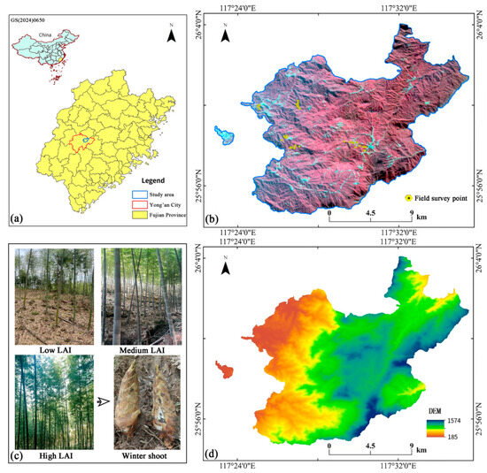 Study site location in (a) Fujian Province, Southeast China (upper left) and in Yong’an City; (b) Field survey point and the R:G:B (B22, B12, and B6) false color composite of OHS-3 images; (c) Low-, Medium-, and High-level leaf area index (LAI) values of Moso bamboo forests (MBFs) and Winter shoot yield in High LAI bamboo forests during the winter growth stage; (d) Digital elevation mode (DEM) for the study area.