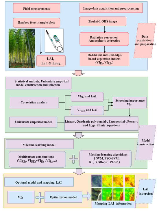 Current research on LAI mapping has primarily focused on crops or forests, with few studies investigating bamboo species (in particular the P. edulis) during the winter growth stage. Given the potential applications of Zhuhai-1 OHS data in bamboo canopy traits inversion and the importance of LAI mapping for management, we selected the abundant bamboo forest area of Fujian Province as the study area and used OHS images to screen sensitive hyperspectral VIs for the retrieval of LAI by integrating the PSO-SVM optimization model and the optimal VIs to construct the optimal LAI inversion model for winter MBFs. The specific objectives of the study were to (1) identify the sensitivity of spectral bands and VIs (red-band and red-edge-band based) to LAI estimation in winter MBFs; (2) evaluate the contribution of an improved PSO-SVM model for estimating LAI; and (3) obtain the optimal model for mapping LAI information, thereby providing a scientific basis for guiding the precise management of MBFs to enhance the bamboo forest management quality.