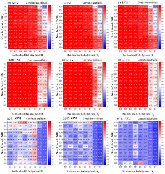 Matrix diagram of correlations between LAI and two- or three-band combined hyperspectral indices (DNVI, ratio vegetation index [RVI], soil-adjusted vegetation index [SAVI], enhanced vegetation index [EVI], and adjusted vegetation index [ARVI]). (a–e) Correlations between hyperspectral vegetation indices and LAI in the entire sample. In (d,e), in the three-band combined indices (EVI and ARVI; Table 2), the blue band is fixed as B1, B2, and B3, respectively. Values are the Pearson correlation coefficients, and colors denote positive or negative coefficient values, where an absolute value >0.405 means the VI was significantly related to the LAI (p < 0.01).