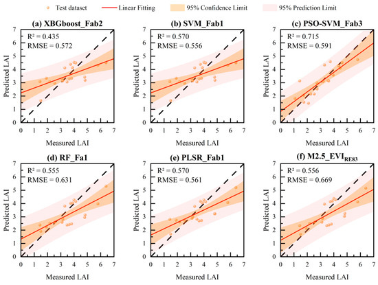 Relationships between measured and predicted LAI values of preferred modeling measures in the test dataset. (a) XBGboost, (b) SCM, (c) PSO-SVM, (d) RF, (e) PLSR, and (f) M2.5.