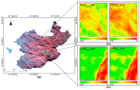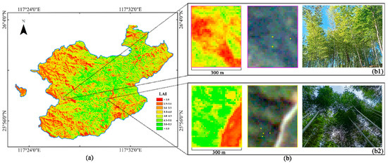 Mapping of LAI distribution of Moso bamboo in the winter growth stage. (a) LAI information mapping based on the optimal PSO-SVM model in the study area; (b) two typical sample plots of Moso bamboo forests with different greenness of bamboo foliage depicted in canopy camera images (b1,b2) and RGB images composited by B12, B6, and B2 bands of OHS.