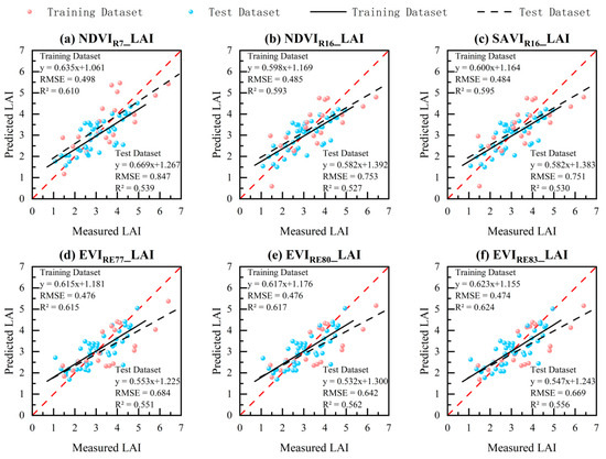 LAI estimated based on VIs vs. measured LAI. (a) NDVIR7, (b) NDVIR16, (c) SAVIR16, (d) EVIRE77, (e) EVIRE80, and (f) EVIRE83.