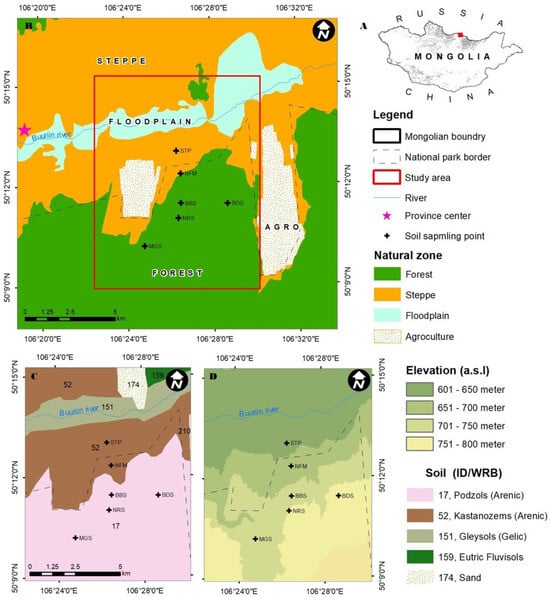 (A) displays the map of Mongolia; (B) illustrates the map of Tujiin Nars Nature Conservation Park, Selenge Province, Mongolia, characterized by various environmental zones; (C) illustrates that the study region is situated inside the Tujiin Nars, characterized by several soil types; (D) elevation of the study area.