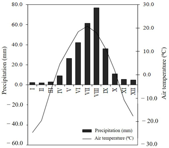 The mean annual temperature was 0.6 ± 0.002 °C and the mean annual precipitation was 280.3 ± 7.3 mm with a precipitation peak between June and August (Figure 2) according to the nearest meteorological station located at Sukhbaatar (50°14′35.063″ N; 106°10′23.008″ E, 621 asl). The soils in the study site are Podzols (arenic) (also called Derno-Forest soils in Mongolia), which were derived from sandy sediments and loess. The sandy loess stratum, which provides the parent materials, is extremely thick and is widely distributed in the study region. The soil is characterized by relatively good water retention but is poorly vegetated due to the climate [16].