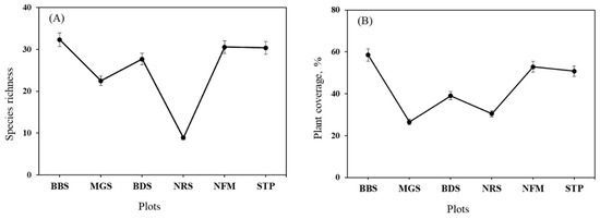 The graphs demonstrate the relationship between species richness and plant coverage percentage across different plot types, suggesting an ecological study comparing different plots. Mean species richness, plant coverage, and error bars indicate standard error of values in different plots. (A) Species richness (ranging from 0 to 40); (B) plant coverage, % (0%–80%).