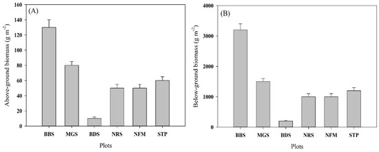 The graphs show a consistent ratio between above- and below-ground biomass across plots and indicate variability or standard error for each plot. (A) Y-axis is above-ground biomass (gm−2), ranging from 0 to 140, (B) Y-axis: below-ground biomass (gm−2), ranging from 0 to 4000 and X-axis: different plot types: BBS, MGS, BDS, NRS, NFM, and STP.