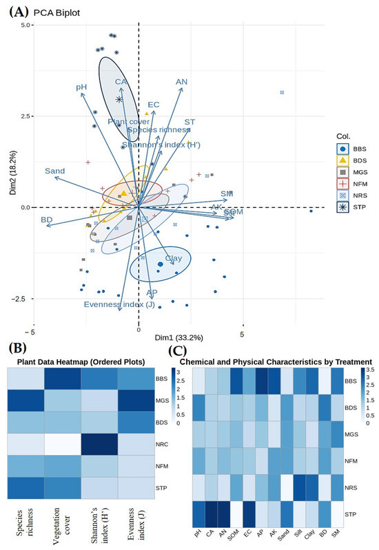 (A) Component analysis (PCA) biplot illustrates the correlations between variables and samples across two main components (Dim1 and Dim2), accounting for 33.2% and 18.2% of the variance, respectively. Arrows: indicate variables (e.g., pH, sand, clay, Shannon’s index, evenness index, etc.). The orientation and magnitude of the arrows signify the influence of each variable on the principal components. Ellipses: indicate clusters of samples (e.g., BBS, MGS, BDS, NRS, NFM, STP) according to their similarity. Principal component analysis and heatmap for vegetation and soil parameters under different plots (BBS, BDS, MGS, NFM, NRS, STP). (B) Heatmap of four vegetation parameters in six different plots. (C) Heatmap of twelve soil parameters in six different plots. This heatmap visualizes plant-related variables (species richness, vegetation cover, Shannon’s index, and evenness index) across different plots (BBS, MGS, BDS, NRS), color gradient: darker blue indicates higher values, while lighter blue indicates lower values.