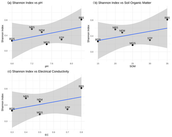 Relationships between Shannon diversity index and soil properties across different plots. Shannon index (H’): ranges from 0.172 to 0.816; assesses species diversity by accounting for both richness and evenness. (a) Shannon vs. pH: ranges from 6.8 to 8.2; quantifies soil acidity and alkalinity. (b) Shannon versus SOM (%): soil organic matter ranges from 15% to 35%, indicating organic content. (c) Shannon versus EC (dS/m): electrical conductivity ranges from 0.3 to 0.8 dS/m and quantifies soil salinity. Note: The blue shading denotes 95% confidence intervals, the trend lines illustrate linear regression fits, and the R2 values reflect the proportion of variation explained.