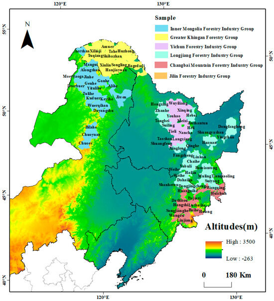 The key state-owned forest regions in northeast China and Inner Mongolia (97°12′–135°05′ E, 37°24′–53°33′ N, Figure 1) are primarily characterized by a cold temperate and temperate continental monsoon climate, with an annual average precipitation of 400–600 mm and an average temperature ranging from −5 °C to 8 °C. The terrain mainly consists of mountains, hills, and plains. The forest management area covers 32.7 million hectares, of which the forested area accounts for 27.2 million hectares, with a forest coverage rate of 82.97%. This region serves as a vital source and water conservation area for the Songhua River, Nen River, and Heilongjiang River systems, their main tributaries, and numerous lakes and reservoirs. It protects over 10% of the nation’s arable land and includes China’s largest grassland, the Hulunbuir Grassland [25].