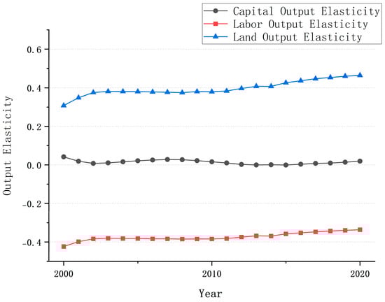 This study employs the Trans-log production function, where the output elasticities of input factors cannot be directly inferred from the regression results. To conduct a comparative analysis of the output elasticities of carbon sequestration input factors, additional calculations based on the regression results are necessary [40]. Additional calculations based on the regression results are essential to conduct a comparative analysis of the output elasticities of carbon sequestration input factors. From the annual average values of the output elasticities, it is evident that land and capital inputs contribute to an increase in carbon sequestration output, while the output elasticity of labor is negative. This could be attributed to excessive or misallocated labor inputs in forest industrial enterprises (forestry farms). The trends in the output elasticities of capital, labor, and land from 2000 to 2020 are shown in Figure 2. The average annual values of output elasticity of capital labor and land are 0.01, −0.37, and 0.40, respectively. During the sample period, the output elasticity of land input is significantly higher than that of capital and labor inputs, indicating that land input remains the primary driver of carbon sequestration output. From the trends in the output elasticities of the three input factors, the output elasticities of land and labor exhibit an upward trend, suggesting that their contributions to carbon sequestration output are gradually increasing, while the output elasticity of capital fluctuates.