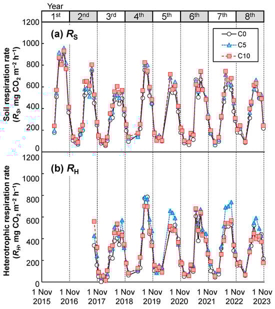 Temporal changes in (a) soil respiration rate (RS) and (b) heterotrophic respiration rate (RH) in the plots with or without biochar. C0, C5, and C10 represent the experimental plots with 0, 5, and 10 Mg ha−1 biochar application, respectively. Values are means (n = 3–4).