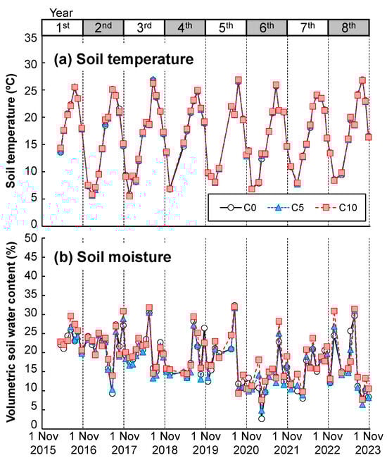 The SR rate (RS) was measured each month in principle from April 2016 to December 2023 using the closed chamber method [24]. In some years, the frequency of measurements during the winter season was reduced because the biological activity was expected to be lower. In addition, measurements were skipped during March–May 2020 because the field survey could not be conducted due to the spread of the coronavirus infection in Japan. Initially, 16 soil collars (21 cm in diameter, 7 cm in height) were installed in each plot but the number was reduced to 8 from May 2019. As described below, one of these collars was assigned to the trenching subplot. At each measurement, each soil collar was covered by a chamber (21 cm in diameter, 7 cm in height) equipped with a portable infrared gas analyzer (GMP343, VAISALA, Helsinki, Finland) and changes in CO2 concentrations within the chamber were recorded at 30-second intervals for 5 min. The RS (mg CO2 m−2 h−1) was calculated using the portion of the data that showed a linear increase in the CO2 concentration. For convenience, the data were categorized from November to October in each of the study years (years 1, 2, 3, … 8).