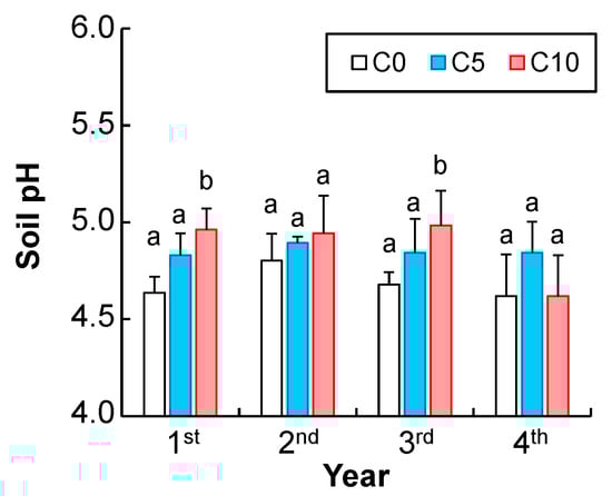 The soil pH tended to be higher in the plots with biochar application than in the control plot for 3 years after biochar application (Figure 3). The pH in C10 was significantly higher than the pH in C0 in the first and third years, although no significant difference was detected in the second and fourth years.