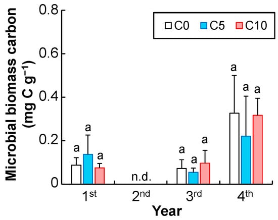 Soil microbial biomass carbon determined with the adenosine triphosphate method in plots with or without biochar. C0, C5, and C10 represent experimental plots with 0, 5, and 10 Mg ha−1 biochar application, respectively. Bars and error bars represent the mean ± SD (n = 4). Bars labeled with different lowercase letters differ significantly (Tukey’s test, p < 0.05). n.d., not determined.
