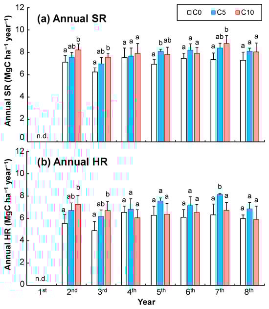 (a) Annual soil respiration (SR) and (b) annual heterotrophic respiration (HR) in the plots with or without biochar from the second to the eighth year. C0, C5, and C10 represent the experimental plots with 0, 5, and 10 Mg ha−1 biochar application, respectively. Bars and error bars represent the mean ± SD (n = 4). Bars labeled with different lowercase letters differ significantly (Tukey’s test, p < 0.05). n.d., not determined.
