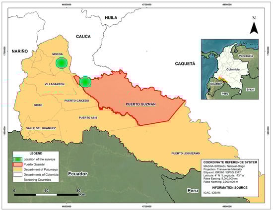 The municipality of Puerto Guzmán, in the department of Putumayo, located in the Amazon region of Colombia, is a critical area within the “arc of deforestation” where it faces the most severe deforestation (Figure 1). Land cover maps have revealed parts of the territory where the homogeneity of land cover has changed [20]. Land cover change in the region dates back to the end of the 19th century, when steamboats were introduced on the Putumayo River to extract cinchona bark (Cinchona sp.) from the forests of the upper Caquetá and upper Putumayo [21].