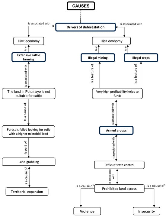 In terms of perception of the causes of deforestation (Figure 3), through the interviews it was identified that there are three main actors of deforestation: extensive cattle ranching, illegal mining, and, finally, illicit crops. Because the land in Putumayo is not suitable for cattle, in order to carry out the extensive cattle ranching practice by the region’s large farmers, the forest needs to be cut down in search of the soils with the highest microbial load. This leads to land grabbing for the territorial expansion required to carry out the livestock activity. In relation to this, one of the NGO officials said the following: