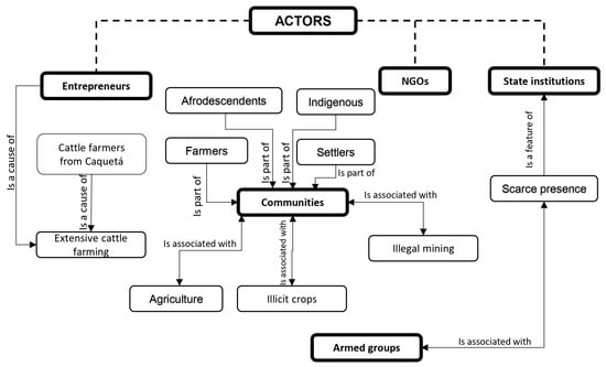 On the other hand, there are the communities (indigenous, farmers, Afro-descendants, and settlers) who have chosen to engage in activities, such as illegal mining and illicit crops, in order to meet their basic needs for health, food, etc., and to survive in a scenario that does not offer them other easily accessible alternatives to acquire the economic resources they need. This situation has been made possible, among other things, by the limited presence of agents such as NGOs and state institutions, which find it difficult to regulate these activities due to the presence of armed groups operating outside the law (Figure 4).