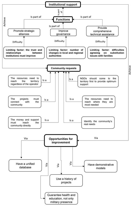 Another of the functions that the institutions should perform, from the point of view of those interviewed, is to improve governance, which is currently limited by the fact that, in the municipality of Puerto Guzmán and the department of Putumayo, the people who occupy local and regional positions of authority are constantly changing, which creates mistrust. Finally, they express that one of the most important functions that the institutions should develop is the provision of comprehensive technical assistance, which is limited by the difficulty of reaching agreements with families on substitution issues.