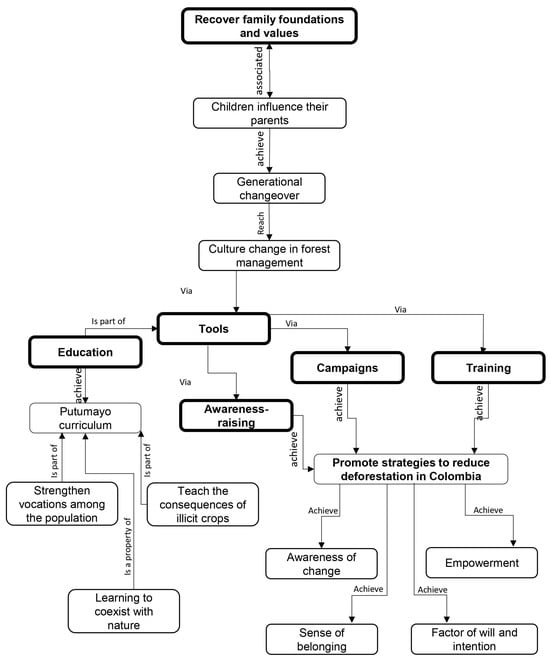 Regarding the perception of education as a medium- and long-term solution (Figure 6), the stakeholders believe that a generational change is needed, where children acquire a change of mentality regarding the management of the deforestation situation in the area. For this to happen, a cultural change in forest management is needed so that young people can recover the foundations and values in the family and influence their parents with these new perspectives and cultures that they acquire.