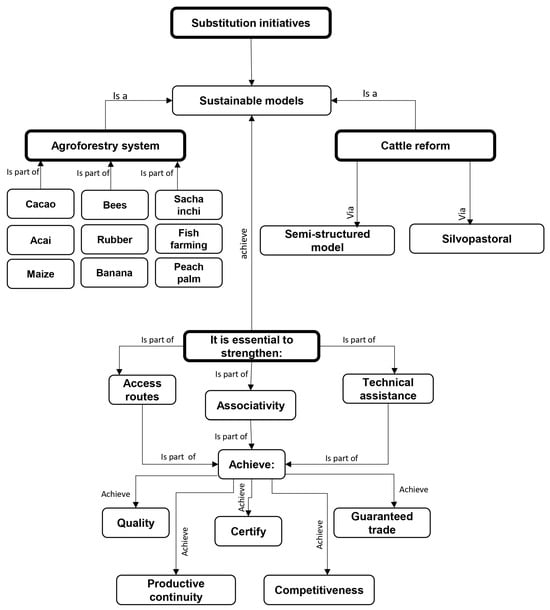 Regarding the interviewees’ perception of illicit crop substitution initiatives (Figure 7), they consider that these initiatives can be implemented through sustainable models, such as agroforestry systems for cocoa, bees, rubber, fish farming, maize, banana, peach palm, sacha inchi, among others. They also state that the sustainable model based on cattle reform can be applied through semi-structured models or models from the silvopastoral system. However, for this to be possible, access, associativity, and technical support must be strengthened in order to certify the quality of the processes carried out, provide guarantees in commercial work, establish good levels of competitiveness, and generate productive continuity.