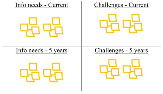 In total, 116 topics were mapped by the stakeholders individually during the first part of the workshop, 70 being challenges and 46 being information needs, and there were more challenges and information needs identified for the present than for the 5-year period (Figure 3B).